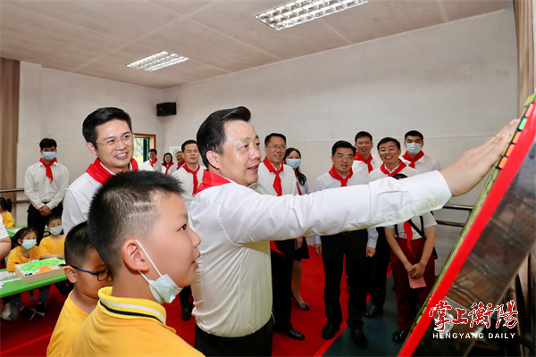来到市青少年宫,“雏雁心向党、逐梦‘中心化’”2022年衡阳市少年儿童庆“六一”主题实践活动正在进行,孩子们通过舞蹈表演、小提琴齐奏、合唱表演等形式,开启了一场“欢乐六一”节日快闪,秦国文为孩子们精彩的表演送上掌声。秦国文还与少年儿童以“童心筑梦‘中心化’”为题,把少年儿童对衡阳建设区域经济、消费、医疗、教育、应急中心的美好愿景画下,共同绘就《七彩衡阳》长卷。