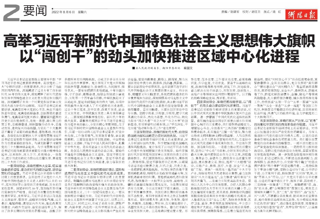 四要深刻领会、准确把握战略擘画,以“闯创干”的劲头奋力建设现代化新衡阳。习近平总书记在省部级专题研讨班上的重要讲话,对以中国式现代化推进中华民族伟大复兴作出新部署,进一步擘画了中国式现代化道路的新图景。衡阳肩负着建设国家区域重点城市和省域副中心城市的历史使命,我们要保持战略定力,增强信心斗志,全面落实“三高四新”战略定位和使命任务,扎实推进“三强一化”建设,努力建设物质文明和精神文明相得益彰、人与自然和谐共生、全市人民共同富裕的现代化,在走好中国式现代化道路中体现衡阳担当、作出衡阳贡献、创造衡阳经验。一是着力推动更高质量发展。坚持以“中心化”为目标,办好发展经济这个最大实事,始终把制造业作为立市之本,深挖潜力、集聚合力、善借外力,持续夯实高质量发展基础,重点推进交通、物流、能源“三大枢纽”建设,实施产业、教育、医疗、生态、安全“五大基础”工程。聚焦“一核两电三色四新”十大主导产业,持续培育壮大先进制造业集群,着力加快建设“八大示范基地”,全力推进“衡阳制造”实现再次腾飞。二是着力实现更高品质生活。坚持以人民为中心的发展思想,办好人民群众牵肠挂肚的民生大事和天天有感的关键小事,让民生福祉更有温度、更具质感。持续推动巩固拓展脱贫攻坚成果同乡村振兴有效衔接,深入推进民生实事“五心工程”,加快补齐教育、医疗卫生、社保、养老等民生领域短板,千方百计稳定和扩大就业,不断增强群众的理论获得感、现实获得感、预期获得感。三是着力促进更高效能治理。强化“时时放心不下”的责任感使命感,紧紧依靠群众、全面发动群众,充分发挥好“衡阳群众”“屋场恳谈会”“湾村明白人”等基层治理品牌作用,抓好疫情防控、安全生产、森林防火、防溺水等工作,防范化解政府债务、金融、房地产等领域风险隐患,扎实做好信访维稳、城乡治理标准化等工作,持续激活“五制一平台”“五单一图谱”“五赋一聚焦”“五全一常态”“五步一规范”等创新工作机制,积极营造平稳健康的经济环境、国泰民安的社会环境、风清气正的政治环境,全力护航党的二十大胜利召开。