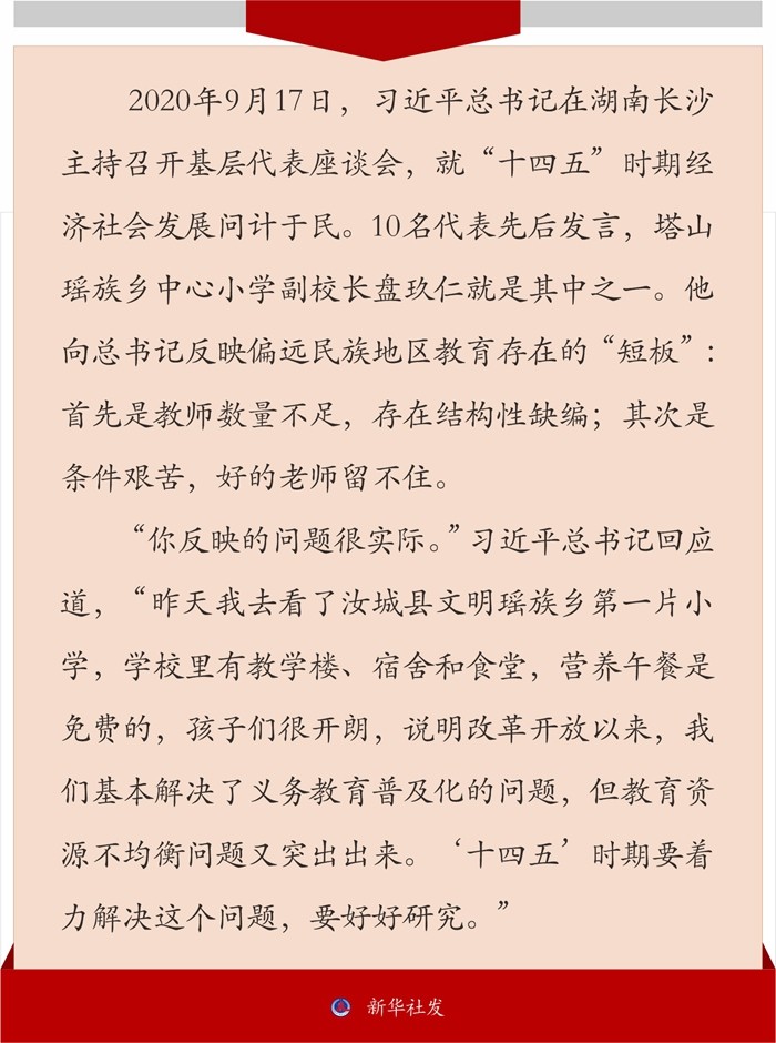 2020年9月17日,习近平总书记在湖南长沙主持召开基层代表座谈会,就“十四五”时期经济社会发展问计于民。10名代表先后发言,塔山瑶族乡中心小学副校长盘玖仁就是其中之一。他向总书记反映偏远民族地区教育存在的“短板”:首先是教师数量不足,存在结构性缺编;其次是条件艰苦,好的老师留不住。