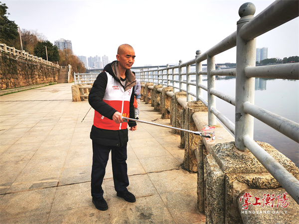 “叔叔您好,我们是‘衡阳群众’志愿者,正在开展巡河净滩志愿服务,希望您与我们一起爱护身边环境,为衡阳创建全国文明城市助力加油。”大学生文书琴对垂钓爱好者说道。