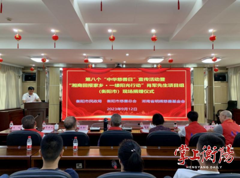 9月12日上午,市慈善总会联合湖南省明辉慈善基金会,举办第八个“中华慈善日”宣传活动暨“湘商回报家乡·一缕阳光行动”肖军先生项目组(衡阳市)现场捐赠仪式。市政协副主席陶朝晖、市慈善总会会长蒋勋功出席。