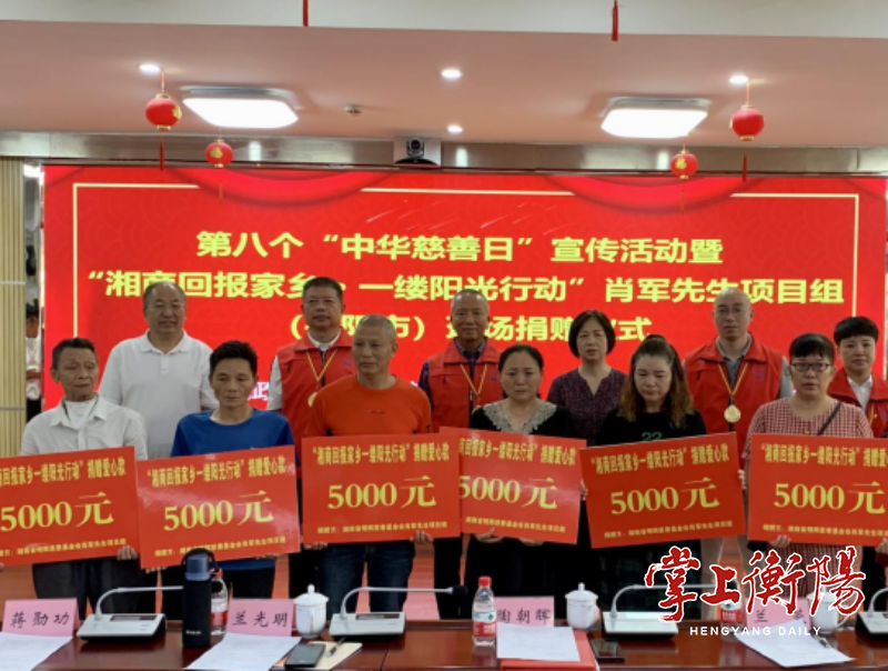 捐赠仪式上,湖南省明辉慈善基金会副理事长、衡阳项目组组长肖军个人全额捐助100户计生特殊家庭50万元。据悉,湖南省明辉慈善基金会于2022年4月成立,“湘商回报家乡·一缕阳光行动”是该基金会确立的第一个帮扶项目,其核心内容是在全省14个州市,联合各市籍的14位企业家牵头,由基金会负责资金兜底,对全省计生特殊家庭中恶性肿瘤患者给予每年每人5000元的现金帮扶,项目计划持续5年。至今累计资助644人,发放善款322万元。