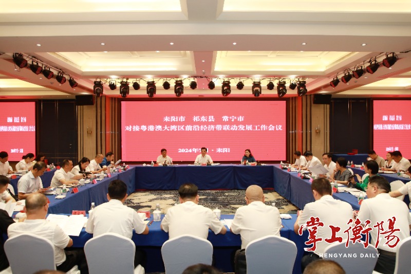 7月26日上午,耒阳市、祁东县、常宁市对接粤港澳大湾区前沿经济带联动发展工作会议在耒阳市召开。衡阳市委副书记、耒阳市委书记赖馨正主持会议并要求,要深入学习贯彻习近平总书记关于区域协调发展的重要论述,加强合作、创新实干,以实实在在的成效推动三县(市)联动高质量发展,打造承接粤港澳大湾区产业转移示范地、优质农副产品主供基地、休闲旅游目的地。