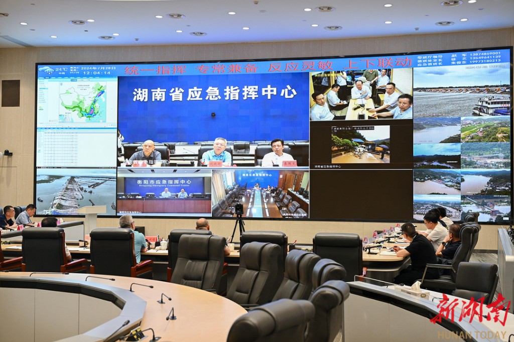 ▲7月28日,沈晓明在省应急指挥中心指挥调度衡阳市南岳区山体滑坡抢险救援工作。