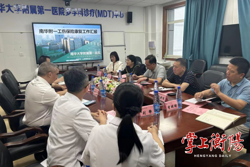 ▲2024年5月,市人社局相关领导带领市工伤保险服务中心负责人等在南华大学附属第一医院调研工伤康复工作。