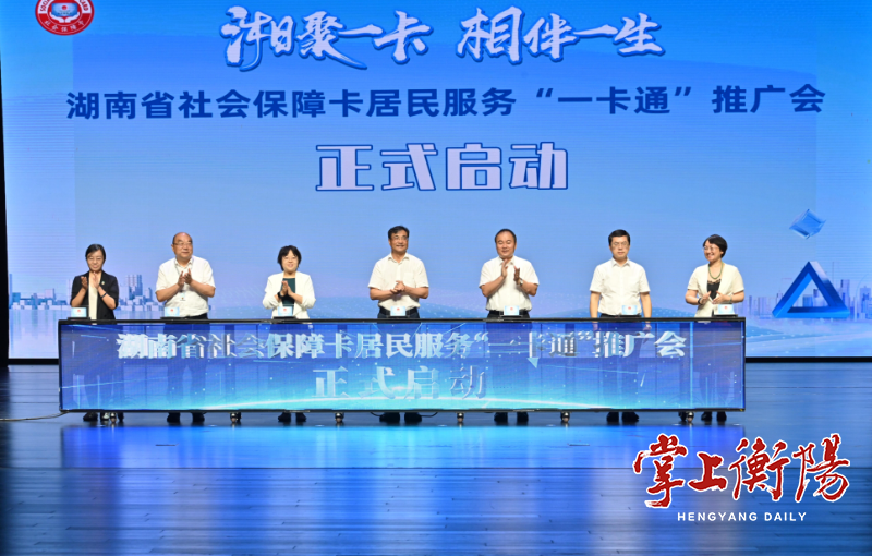 ▲2024年7月26日上午,省人社厅厅长李永军(中)、市长朱健(右三)等领导共同出席在衡阳举行的湖南省社会保障卡居民服务“一卡通”推广会。