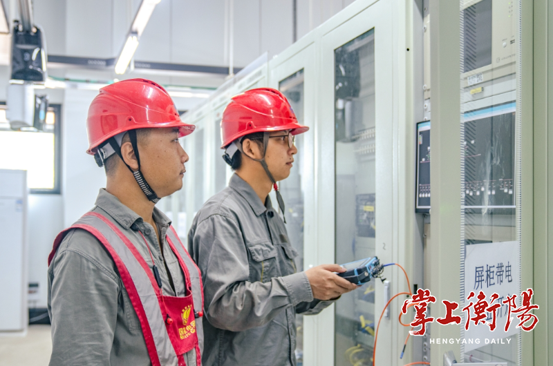 ▲工作人员对站内设备开展投运前测试验收。陈明摄