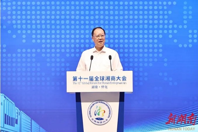 毛伟明在致辞中说,恰逢中秋佳节,更喜万商云集。全球湘商大会首次走进大湘西,这既是怀化的盛事,也是全省的大事,更是全球湘商的喜事,借此机会,为大家带来一张三湘发展的成绩单、一封湘商兴湘的感谢信、一份湘商回归的邀请函。他指出,今天的湖南已经站在新的历史起点,地区生产总值突破5万亿元、稳居全国十强,营商环境步入全国先进行列。感谢大家在纵横商海中彰显的湖南力量、在建功三湘中铸就的湖南精彩。在外规模超400万家、资产超4万亿的湘商力量,提升了湖南美誉度、影响力。他表示,广大湘商的大力支持,让湖南更胜往昔、更有活力。湘江潮涌连五洲,明月何曾是两乡,诚邀大家积极投身实现“三高四新”美好蓝图的火热实践,在双向奔赴中实现共生共赢。湖南将持续擦亮“身在湖南、办事不难”服务品牌,让“迎老乡、回故乡、建家乡”持续发扬光大。