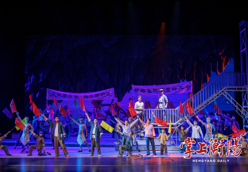 当童谣《水口山来山连山》在舞台上悠扬唱响,宛如天籁,穿越时空的壁垒,一幅壮丽的画卷缓缓展开:在那幽暗的矿洞深处,水口山的矿工们挥汗如雨,用坚韧的双手敲打着沉重的矿石,奏响了生命的交响;而在阳光照耀的大地上,他们“敲砂磨拐”,以辛勤和智慧书写着属于自己的英雄史诗。这一刻,观众仿佛穿越时空,置身于那个英雄辈出的时代,心中涌动着无尽的敬畏与感慨。