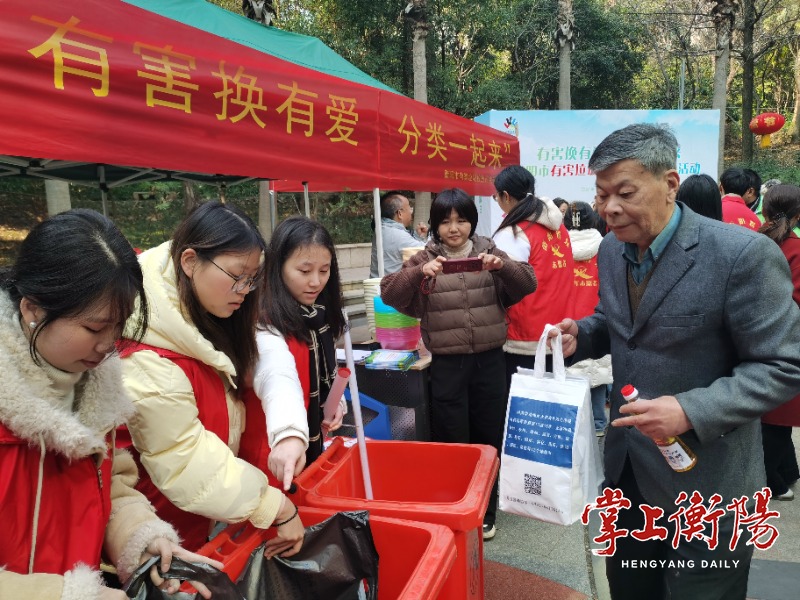 “废弃电池放左边桶,过期药品放右边桶,有害垃圾集中投放处置有利于减少对环境的污染……”1月20日,沐淋美郡小区东广场像过节一样热闹,我市首个“有害垃圾投放日”主题宣传活动在这里举行。小区居民提着自家的废弃电池、过期药品、废旧灯管等有害垃圾,排队兑换奖品,脸上洋溢着开心的笑容。此次活动由市城市管理局联合蒸湘区城管执法局共同举办,200余名社区居民踊跃参加。