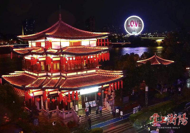 ▲湘江东岸红灯映亭阁,流光溢彩。