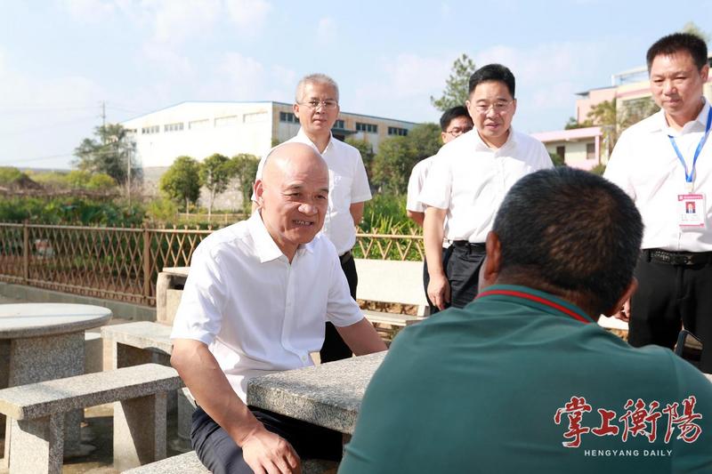 ▲10月11日,刘越高在常宁市曲潭街道连心社区金塘安置点,调研安置点住房质量和帮扶车间运营情况。