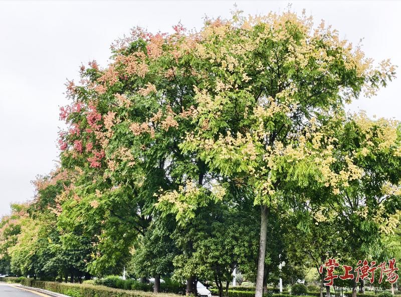 ▲秋意渐浓,栾树悄然“换装”,“绿、黄、红”三色同框。