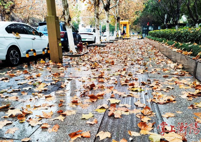 ▲冷空气发威,气温回落,人行道上落叶缤纷。