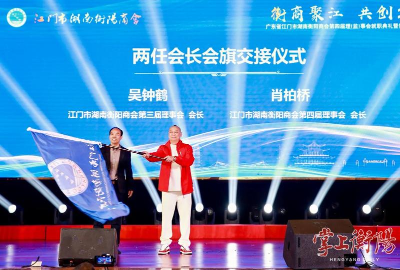 典礼上,两任会长交接会旗,新一届理事会及荣誉成员获颁牌匾。新任会长肖柏桥表示,商会将做好家乡政策的“宣传员”和投资引路的“引导员”,精准对接粤港澳大湾区资源,推动更多资本、项目和人才关注衡阳、回归衡阳、落户衡阳。