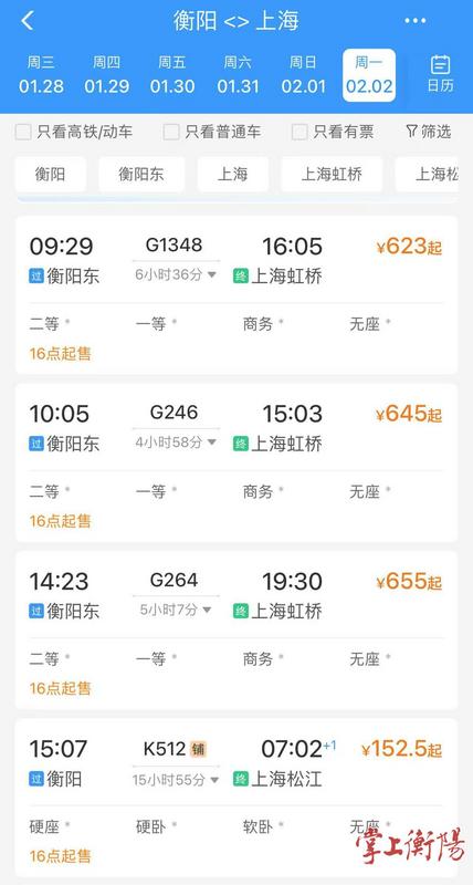 记者登录12306铁路购票平台查询发现,截至1月19日下午4时许,2月2日已开售的车票中,衡阳前往上海、广州、杭州、武汉、西安等地的绝大多数高铁车次和普速列车车票已售罄,仅少数车次还剩余少量一等座和商务座车票。相比之下,衡阳前往北京、深圳、成都、重庆、南宁以及省内城市如长沙、岳阳、株洲、郴州等地的高铁车票,目前尚有少量余票可供选择。