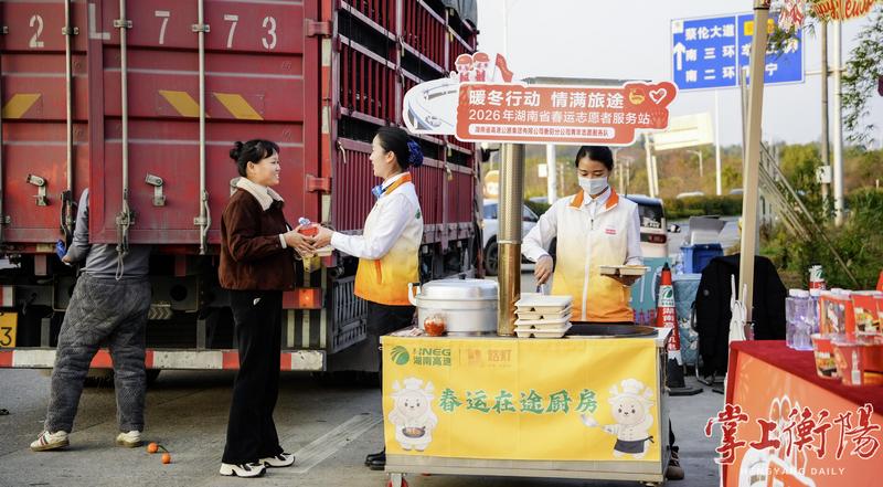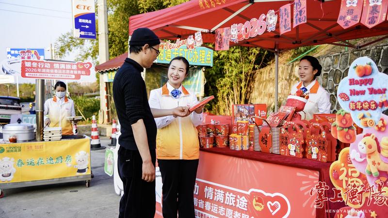 其中,雁峰收费站还创新了服务模式:将便民餐车升级为“春运移动厨房”,开设“年味专窗”,现场烹饪水饺、汤圆等年味美食,搭配热汤暖饮,让奔波中的司乘随时感受家的温暖;设立“新春年货铺”,陈列衡阳特产三黄鸡、祁东黄花菜等,并提供代买代办服务,打通年货回家的“最后一公里”;还依托云端直播实时播报路况,连线路管巡查员讲解安全要点,直播间变身“云端年味馆”,让春运路满载温情。
