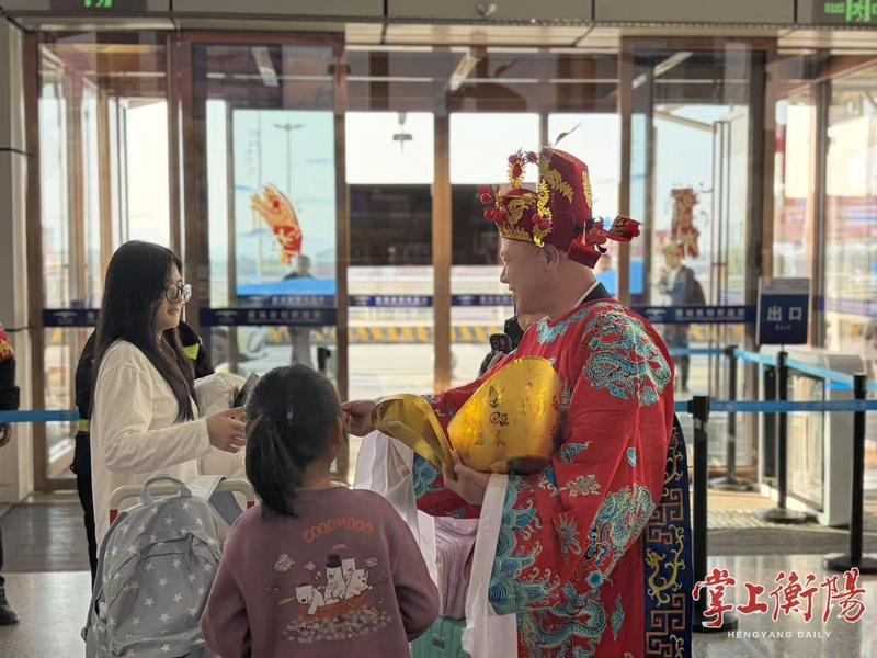 为进一步营造浓厚的春节氛围,让旅客拥有更加喜庆、温暖的归途体验,机场还结合衡阳市文旅广体局“新春送福”相关工作部署,在航站楼开展“福运相伴 情暖归途”旅客互动活动,通过“财神”“福神”等充满美好寓意的形象装扮及赠送精美文创小礼品等方式,以喜闻乐见的精彩节目和有温度、有质感的贴心服务,让机场成为衡阳这座城市的温馨窗口。