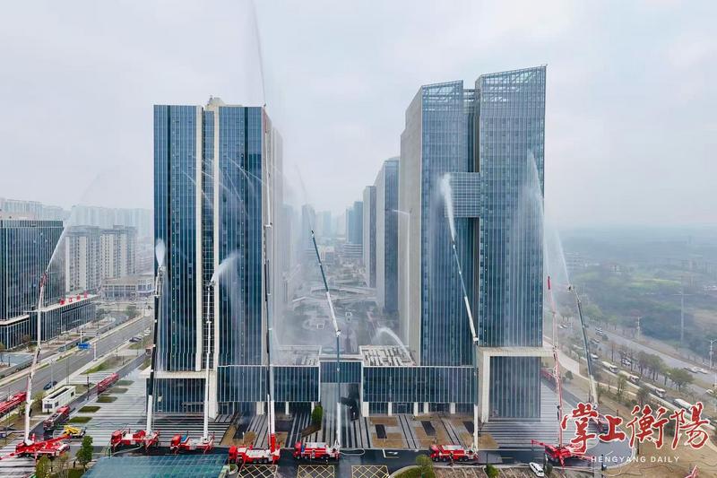 演练模拟“高新技术开发区总部基地”项目5栋15-22层电缆井起火并引燃周边可燃物,造成多个楼层起火,大量人员被困。同时火借风势形成大量飞火,引燃1栋外墙保温材料,情况万分危急。演练紧贴实战需求,共设置单位初期处置、机巢无人机先期侦察、到场灾情侦察、市级联动响应、人员疏散及被困人员核实、电缆井火灾扑救及排烟、总攻灭火等17个科目,全流程、全要素模拟高层建筑火灾应对处置工作。