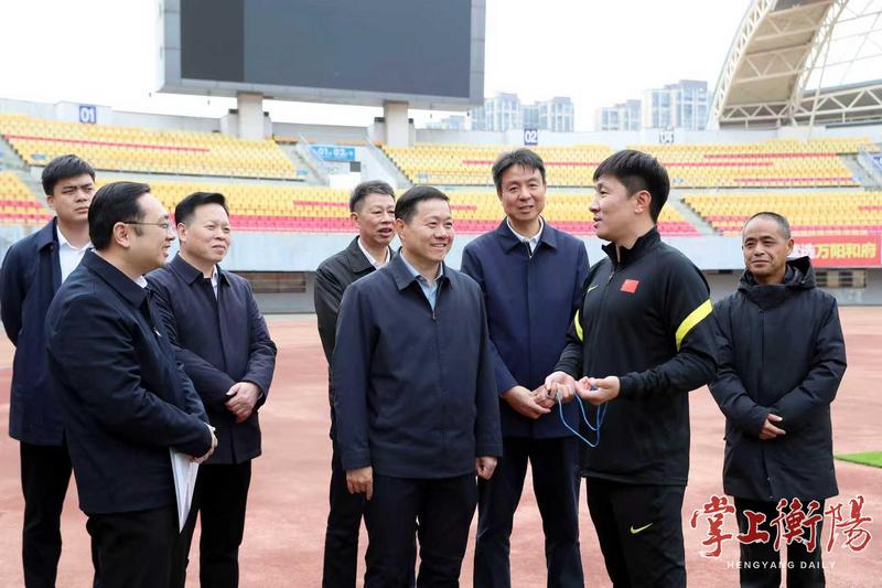 ▲3月6日下午,刘中杰在市体育中心体育场调研“湘超”衡阳队训练情况。