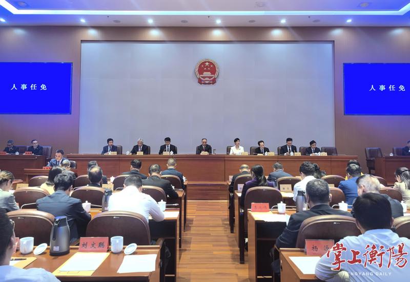 会议表决通过了有关人事任免事项,决定任命江滔为衡阳市人民政府副市长;汪净为衡阳市人民政府副市长;吴旭东为衡阳市人民政府秘书长、市人民政府办公室主任;刘英为衡阳市发展和改革委员会主任、市国防动员办公室主任;林喜洋为衡阳市审计局局长。决定免去廖义智的衡阳市人民政府秘书长职务;林喜洋的衡阳市发展和改革委员会主任、市国防动员办公室主任职务;吴旭东的衡阳市科学技术局局长职务;万春生的衡阳市民族宗教事务局局长职务;刘英的衡阳市卫生健康委员会主任职务;邱小兵的衡阳市审计局局长职务。同时,还任免了其他干部。邹致和为本次会议任命的人员颁发任命书,被任命人员向宪法宣誓。