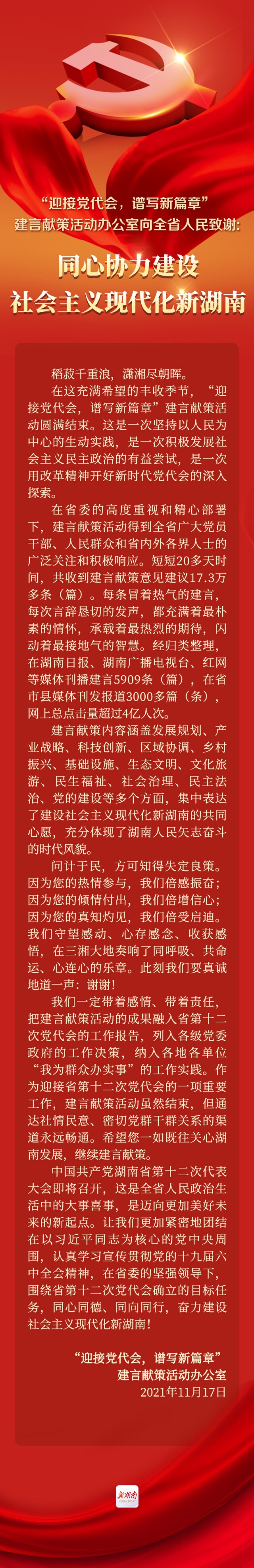 “迎接党代会,谱写新篇章”建言献策活动办公室向全省人民致谢:同心协力建设社会主义现代化新湖南