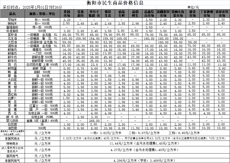 【物价】 2025-1-1衡阳市民生价格信息