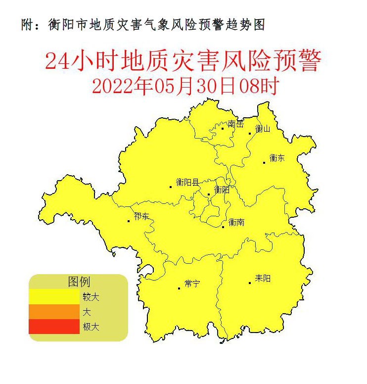 根据气象预报,29日20时至30日08时衡阳市中北部出现暴雨,预计未来24小时衡阳有大到暴雨。根据地质灾害成灾规律、孕灾条件分析,结合短期气象预报结论,预测24小时内,受降雨影响,衡阳发生地质灾害风险较大,达黄色预警。