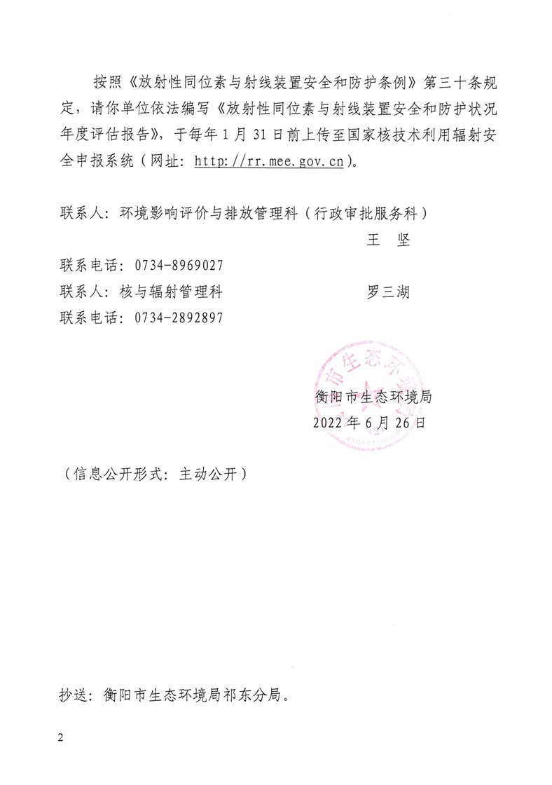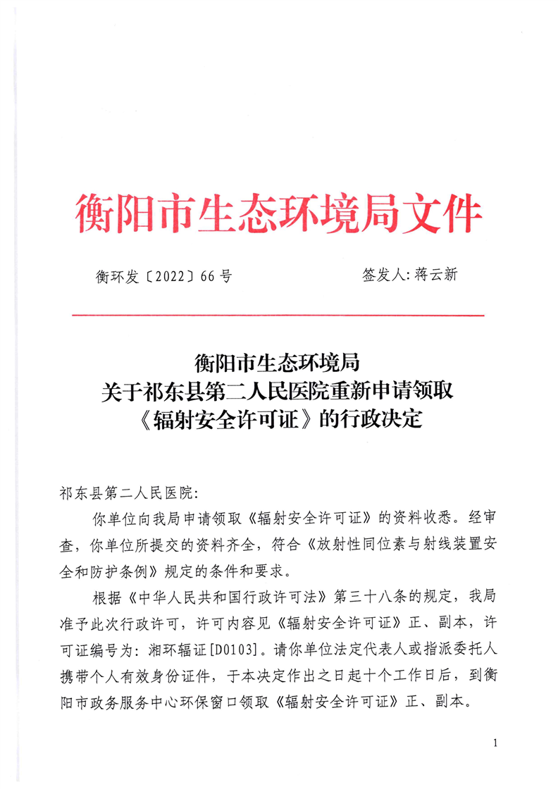 关于祁东县第二人民医院重新申请领取《辐射安全许可证》的行政决定