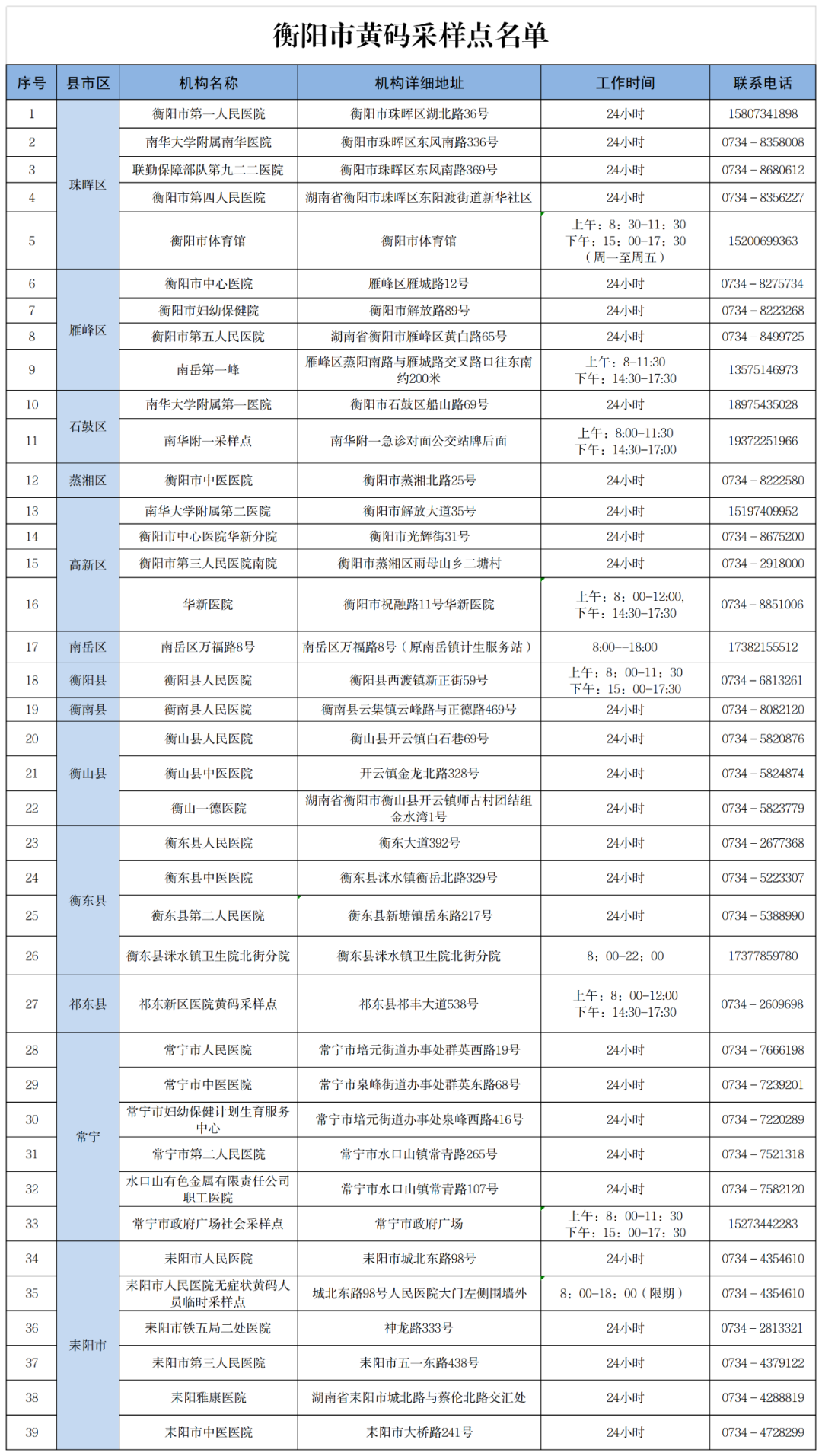 衡阳市新冠疫情防控指挥部近期公布的全市39家黄码人员新冠病毒核酸采样点的服务信息如下。