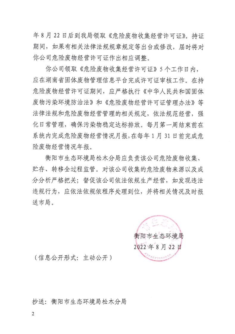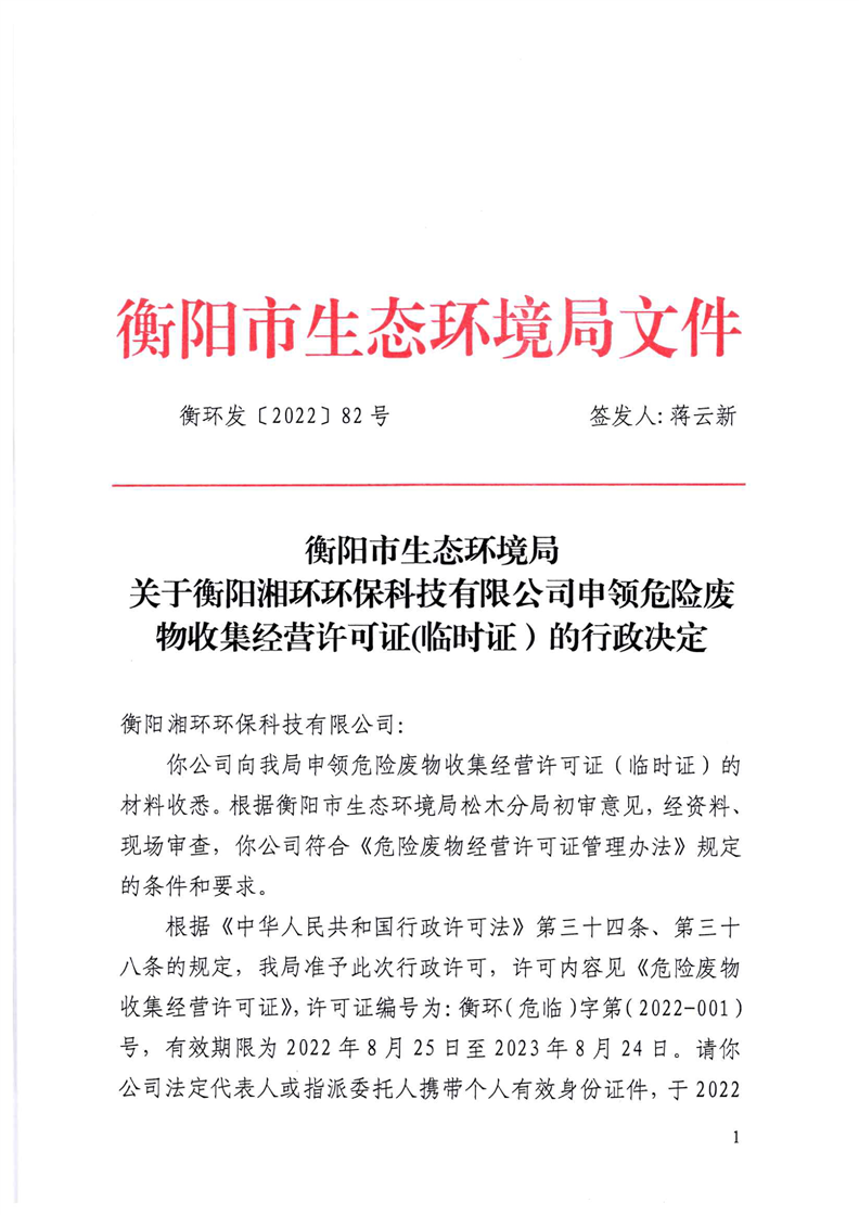 衡阳市生态环境局关于衡阳湘环环保科技有限公司申领危险废物收集经营许可证(临时证)的行政决定