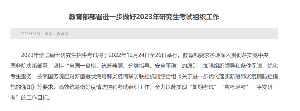 2023年全国硕士研究生招生考试将于2022年12月24日至26日举行。教育部要求各地深入贯彻落实党中央、国务院决策部署,坚持“全国一盘棋,统筹兼顾、分类指导、安全平稳”的原则,加强组织领导和条件保障,优化考生服务,按照国务院应对新型冠状病毒肺炎疫情联防联控机制综合组《关于进一步优化落实新冠肺炎疫情防控措施的通知》等要求,高效统筹做好疫情防控和考试组织工作,全力以赴实现“如期考试”“应考尽考”“平安研考”的工作目标。