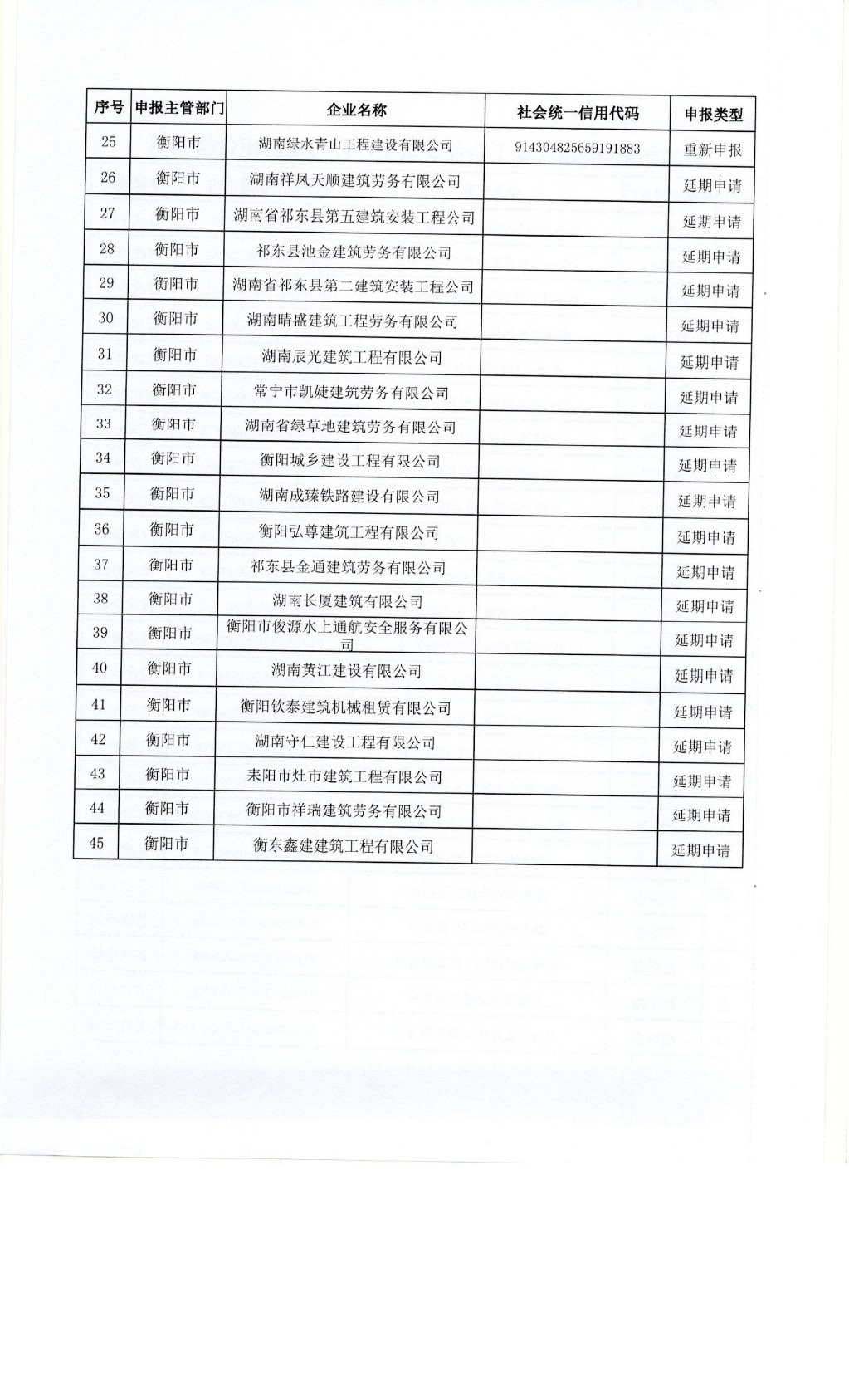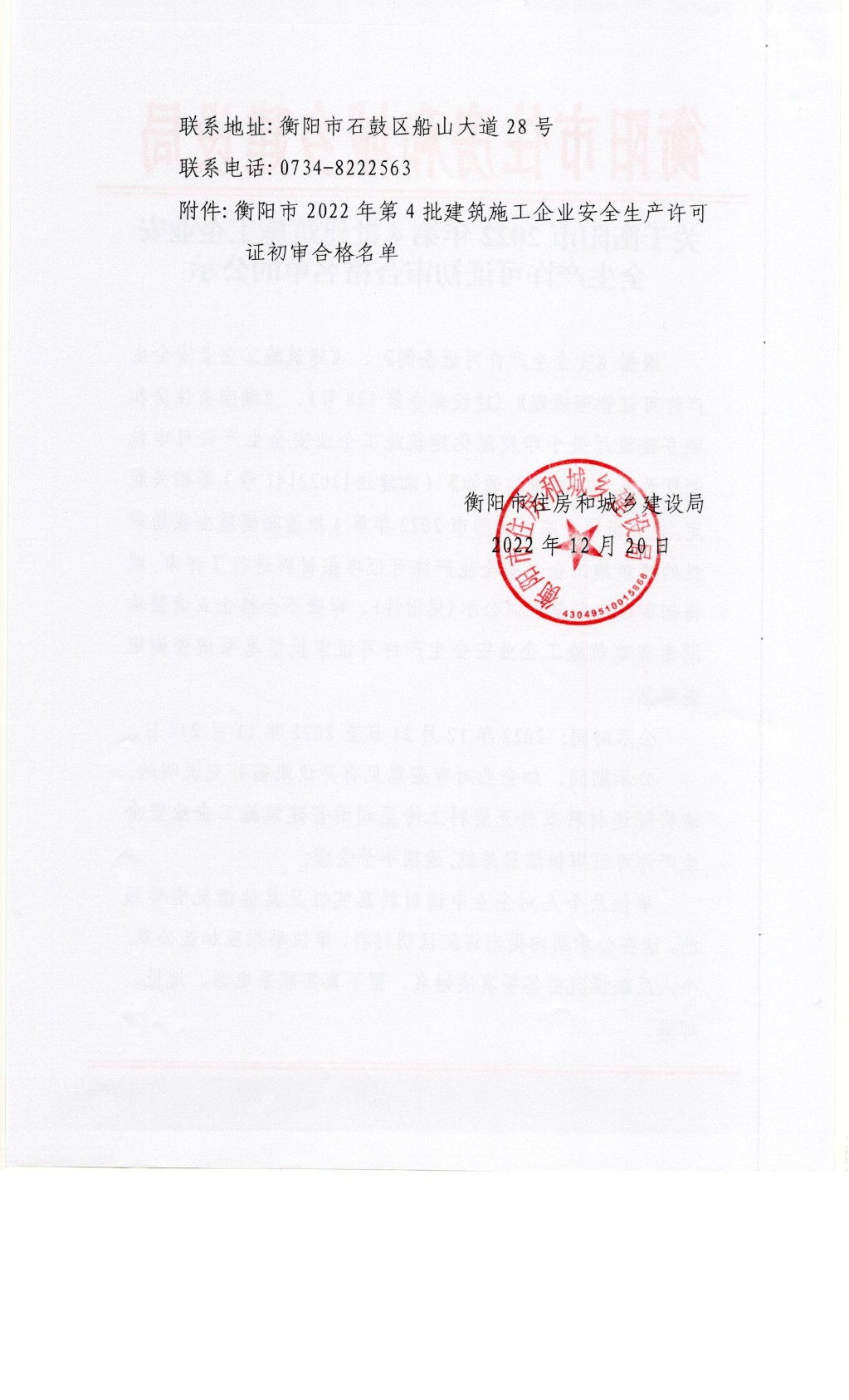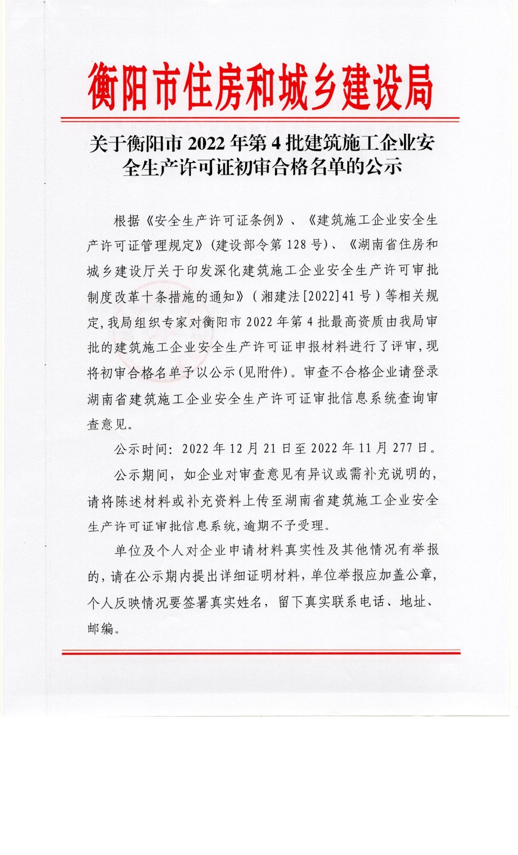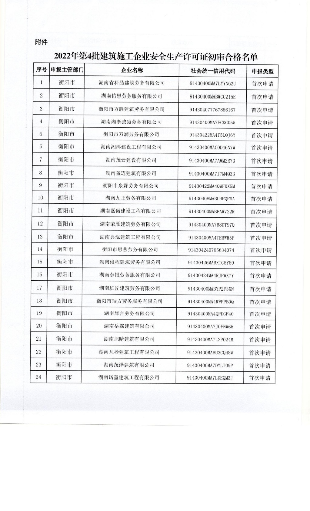 关于衡阳市2022年第4批建筑施工企业安全生产许可证初审合格名单的公示