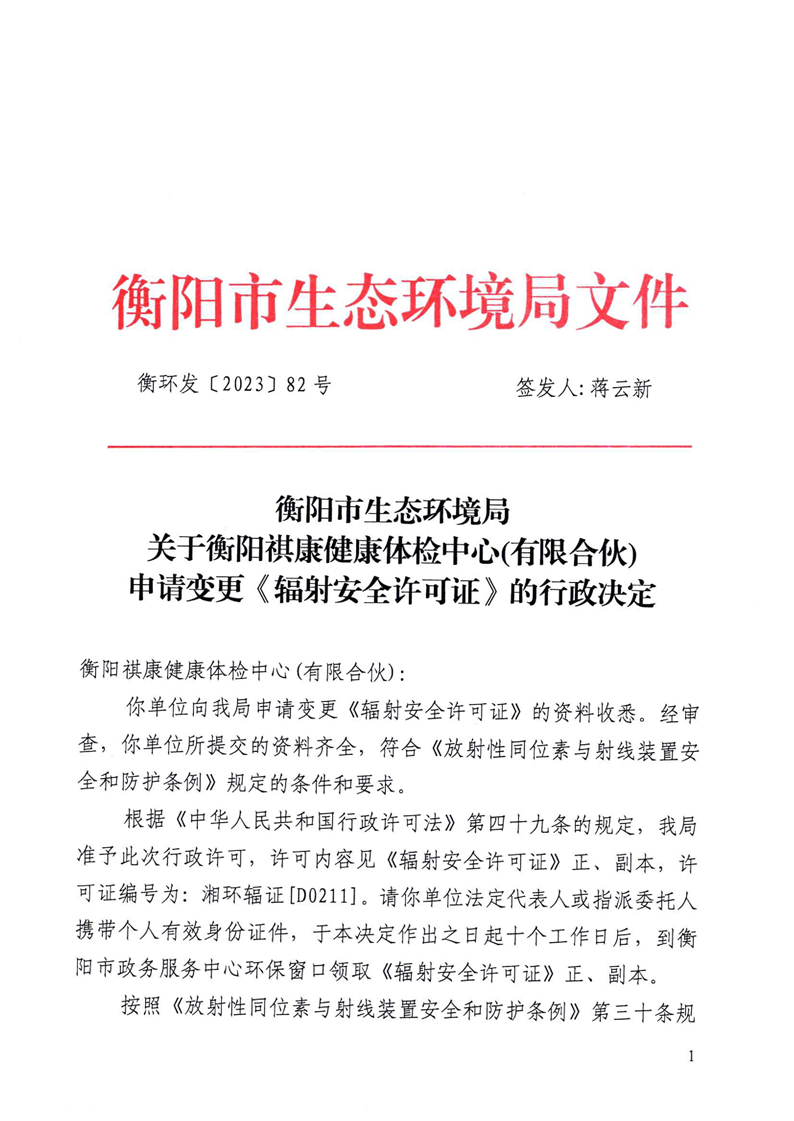 关于衡阳祺康健康体检中心(有限合伙)申请变更《辐射安全许可证》的行政决定