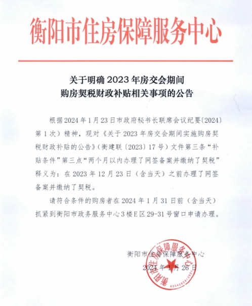 日前,笔者从衡阳市住房保障服务中心获悉,为明确2023年房交会期间购房契税财政补贴时限,市住保中心根据1月23日市政府秘书长联席会议纪要精神,对我市2023年房交会期间实施购房契税财政补贴中“两个月以内办理了网签备案并缴纳了契税”释义为:在2023年12月23日(含当天)之前办理了网签备案并缴纳了契税。