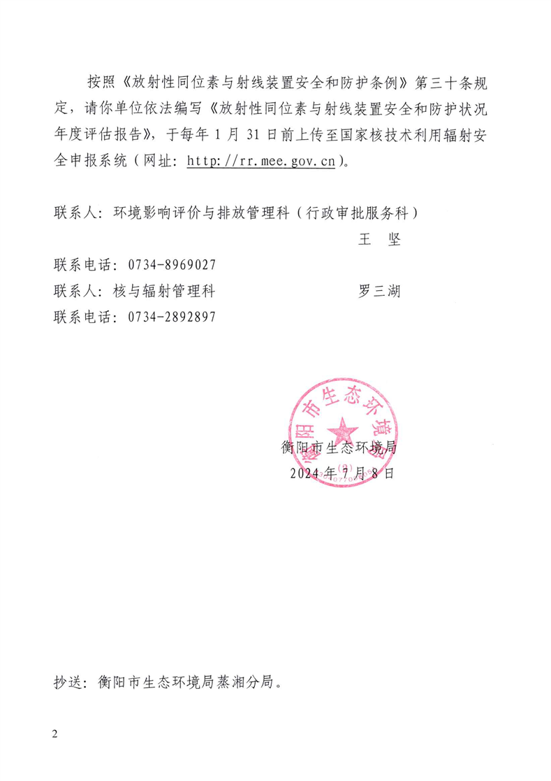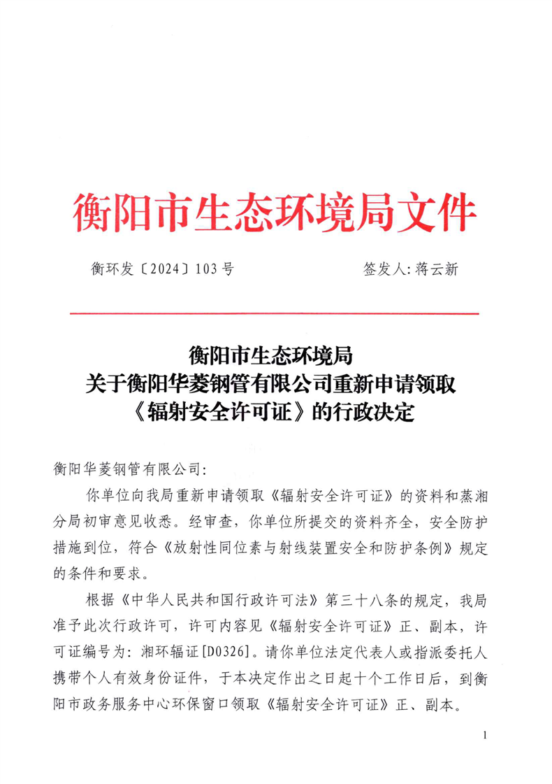 关于衡阳华菱钢管有限公司重新申请领取《辐射安全许可证》的行政决定