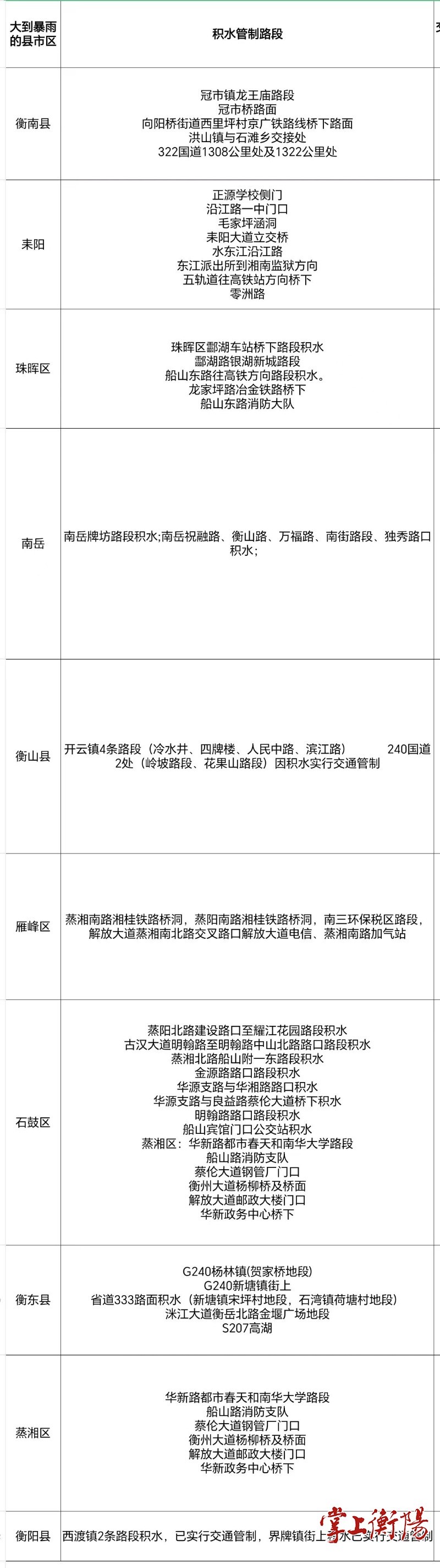 记者从衡阳市公安局交警支队了解到,受强降雨影响,衡阳部分路段内涝积水,请广大市民提前绕行。