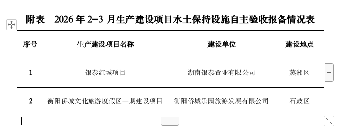 根据《国务院关于取消一批行政许可事项的决定》(国发〔2017〕46号)《水利部关于加强事中事后监管规范生产建设项目水土保持设施自主验收的通知》(水保〔2017〕365号)《水利部办公厅关于印发生产建设项目水土保持监督管理办法的通知》(办水保〔2019〕172号)有关规定,2026年2-3月,我局接受了2个生产建设项目水土保持设施自主验收的报备。现予以公告,公告期2026年4月1日—2026年4月7日。