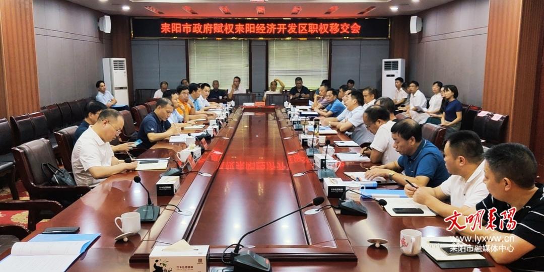 9月17日下午,耒阳市政府赋权耒阳经济开发区职权移交会召开,耒阳市政府向经济开发区赋予130项管理权限,进一步优化园区经济社会发展环境,实现“园中事、园中办、园中结”目标。市委常委、副市长周斐主持会议并讲话。市经济开发区领导曾三成、李春生、王威、郭伟出席会议。