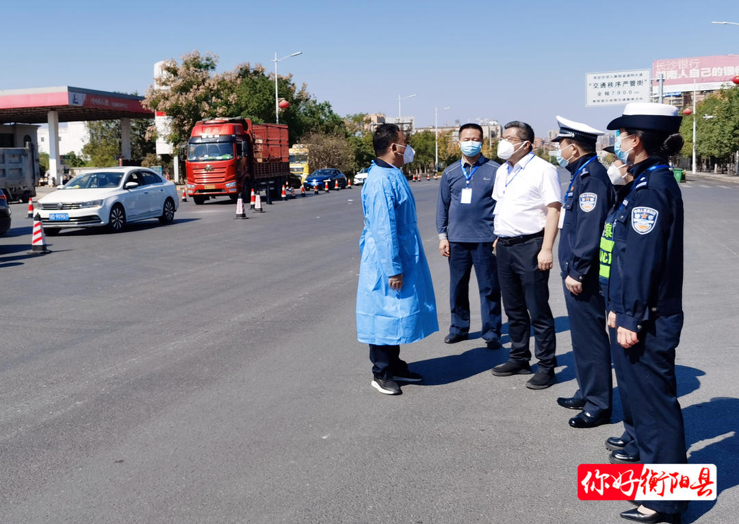 ▲衡阳县纪委监委主要负责人钟斌(左三)带队在S336省道农业示范园卡口开展疫情防控监督检查