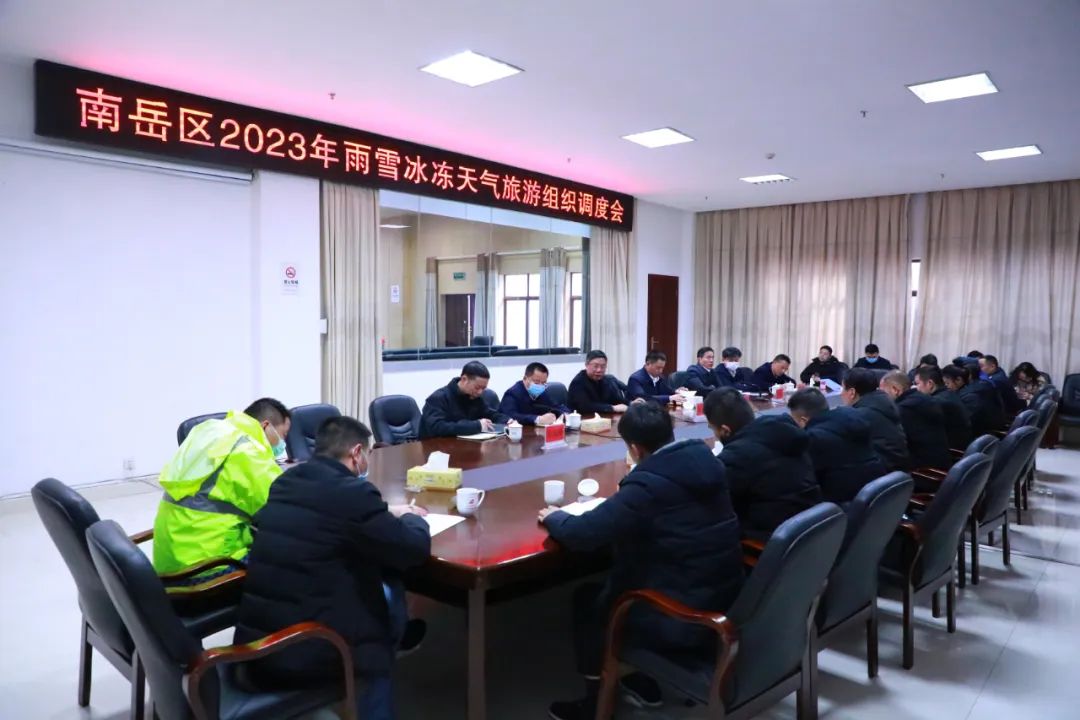 1月16日上午,南岳区召开雨雪冰冻天气旅游组织调度会,区委书记刘浪强调,要牢固树立“安全第一,游客至上”的思想,完善应急预案、理顺指挥体系、做好服务保障、加大执法打击,全力保障游客安全,确保旅游组织平稳有序。区委副书记、区长蒋炳炎主持。