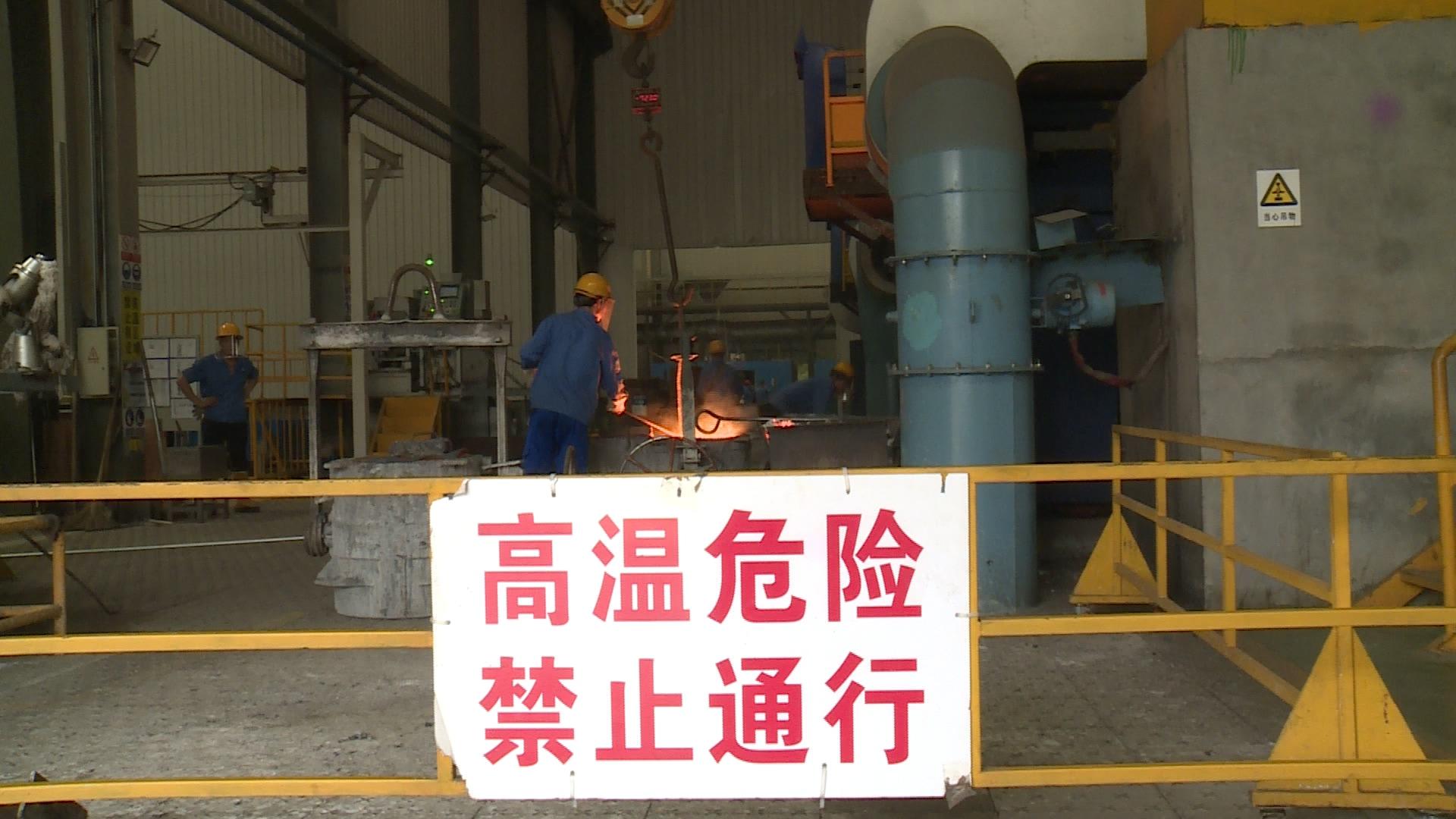 近日,记者走进湖南机油泵股份有限公司看到,车间内的热浪扑面而来。“1333”摄氏度的数字非常醒目。身穿蓝色制服的工人正在娴熟地操作机器将闪烁火光的铁水倒入铁桶中,黄色的警示语“高温区域,禁止靠近”提示人们注意车间的“火热”。