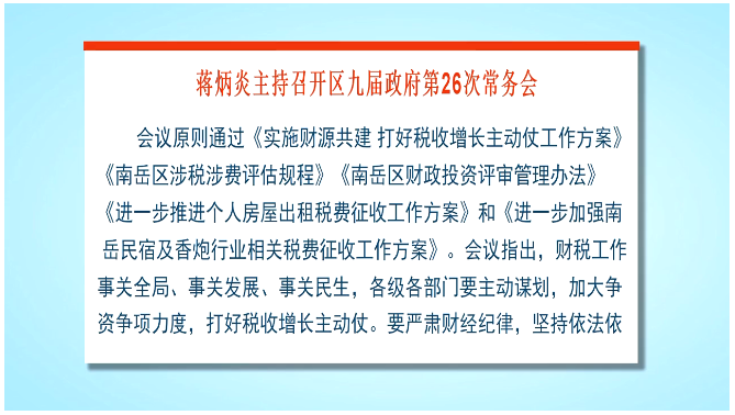 会议原则通过《实施财源共建打好税收增长主动仗工作方案》《南岳区涉税涉费评估规程》《南岳区财政投资评审管理办法》《进一步推进个人房屋出租税费征收工作方案》和《进一步加强南岳民宿及香炮行业相关税费征收工作方案》。会议指出,财税工作事关全局、事关发展、事关民生,各级各部门要主动谋划,加大争资争项力度,打好税收增长主动仗。要严肃财经纪律,坚持依法依规,公开公正公平、实事求是、奖罚分明的原则全面推进财税工作落实。要本着强化宣传、依法开展、稳妥推进、失职追责、确保实效的目的压实税费征缴责任,增强企业和市民纳税意识和法治观念,为南岳经济高质量发展提供坚实财力保障。