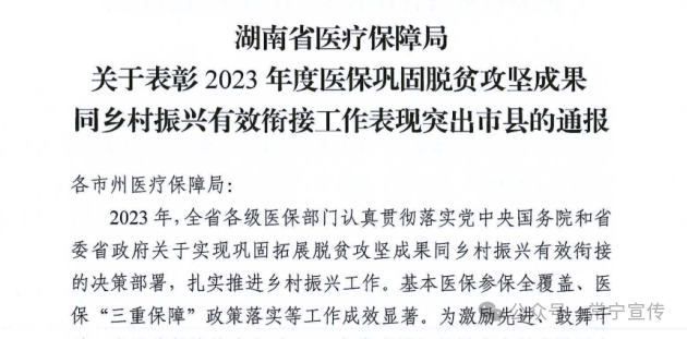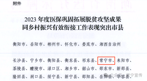 近日,湖南省医疗保障局下发《关于表彰2023年度医保巩固拓展脱贫攻坚成果同乡村振兴有效衔接工作表现突出市县的通报》,对扎实推进乡村振兴工作,基本医保参保全覆盖、医保“三重保障”政策落实等工作成效显著的市县进行通报表扬,常宁市医疗保障局连续3年荣获此殊荣。