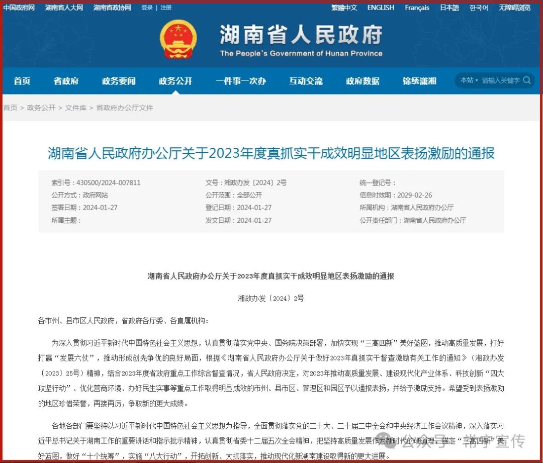 1月27日,湖南省人民政府网站发布了《关于2023年度真抓实干成效明显地区表扬激励的通报》,公布了2023年度真抓实干成效明显地区予以表扬激励的名单及激励措施。其中,常宁获得两项真抓实干表扬激励,奖励总金额200万元。具体如下: