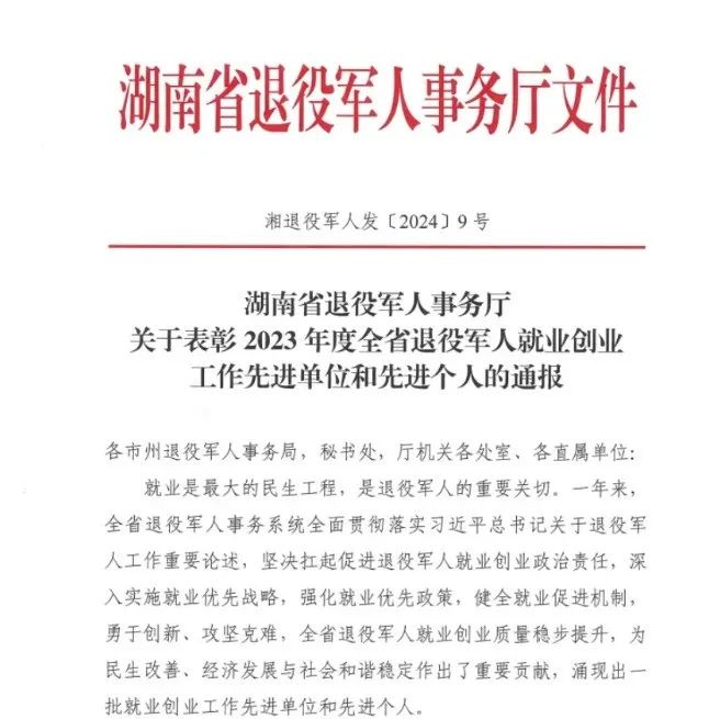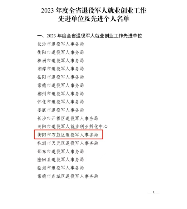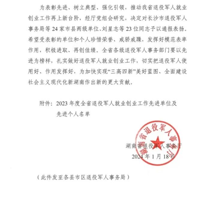 同时,注重抓典型树榜样,激励退役军人敢为人先的创业精神。着力挖掘退役军人曹刚修、邹肇睿等创业成功典范,凝聚正能量。曹刚修作为衡阳市万居国际家具广场的掌门人,发挥自身优势,常年致力于帮助退役军人就业创业,2017年被评为衡阳市"双带双促"先进典型,2019年荣获"全国模范退役军人"称号。邹肇睿创办军创企业“衡阳净界古坊研酒院”并担任董事长,创办“一对一助学网”常年坚持慈善公益助学,荣获2023年衡阳市“最美退役军人”称号。两人先进事迹被收录进省厅退役军人“每日一星”专栏。