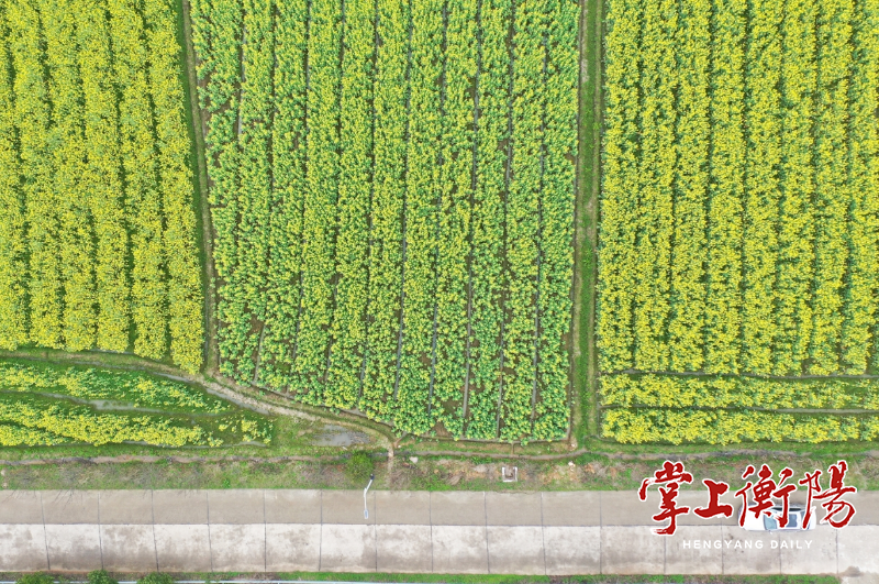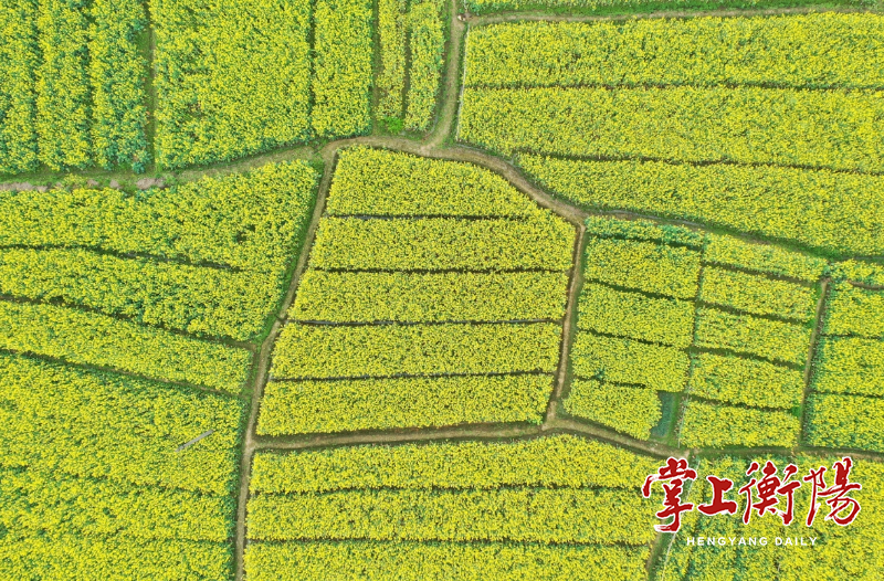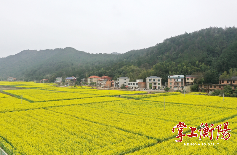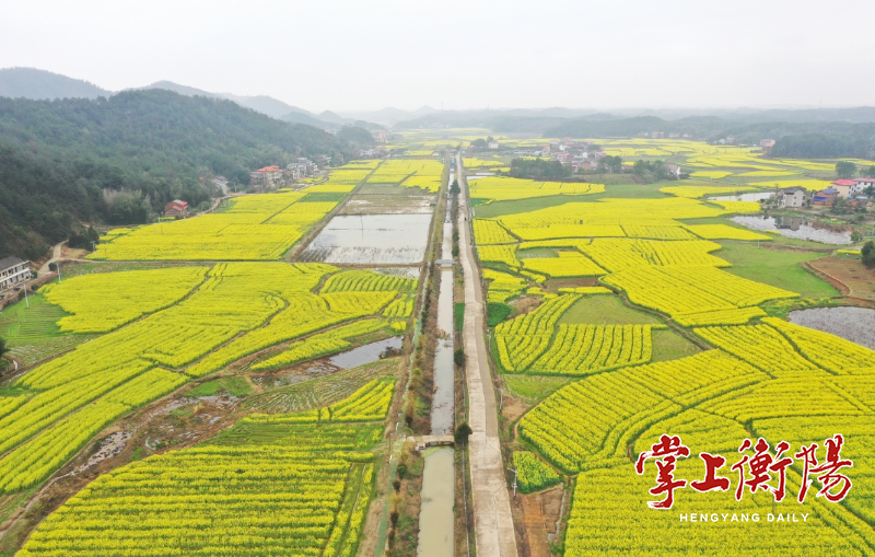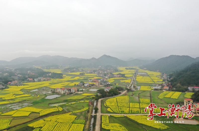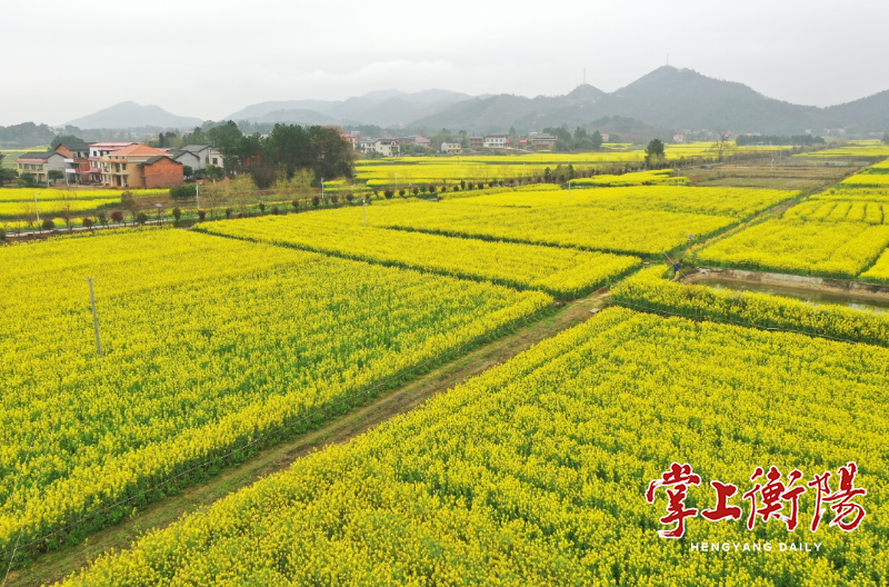 3月16日,衡阳县杉桥镇白石园村,正值油菜花盛开时节,千亩金黄色的花海蔓延在山谷平原,如同大地上的一幅画卷,吸引了众多游客驱车前来打卡观赏。