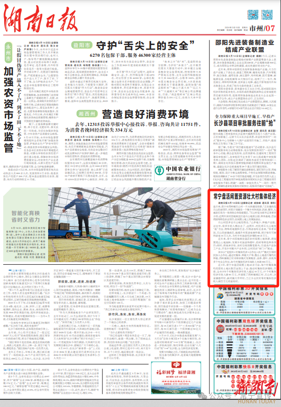 3月15日,《湖南日报》市州07版刊发《 常宁盘活闲置资源壮大村集体经济 》,推介常宁因地制宜盘活农村闲置土地资源,发展乡村旅游和烟叶、药材等特色种养项目,开设乡村振兴产业车间,让村民在“家门口”就业……全文如下: