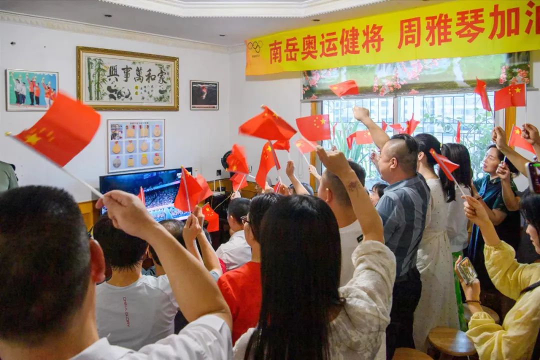 比赛当天,周雅琴的亲友、启蒙教练及家乡人民在不同场地集中观看了巴黎奥运会女子平衡木决赛盛况,共同见证了周雅琴摘银荣誉时刻。