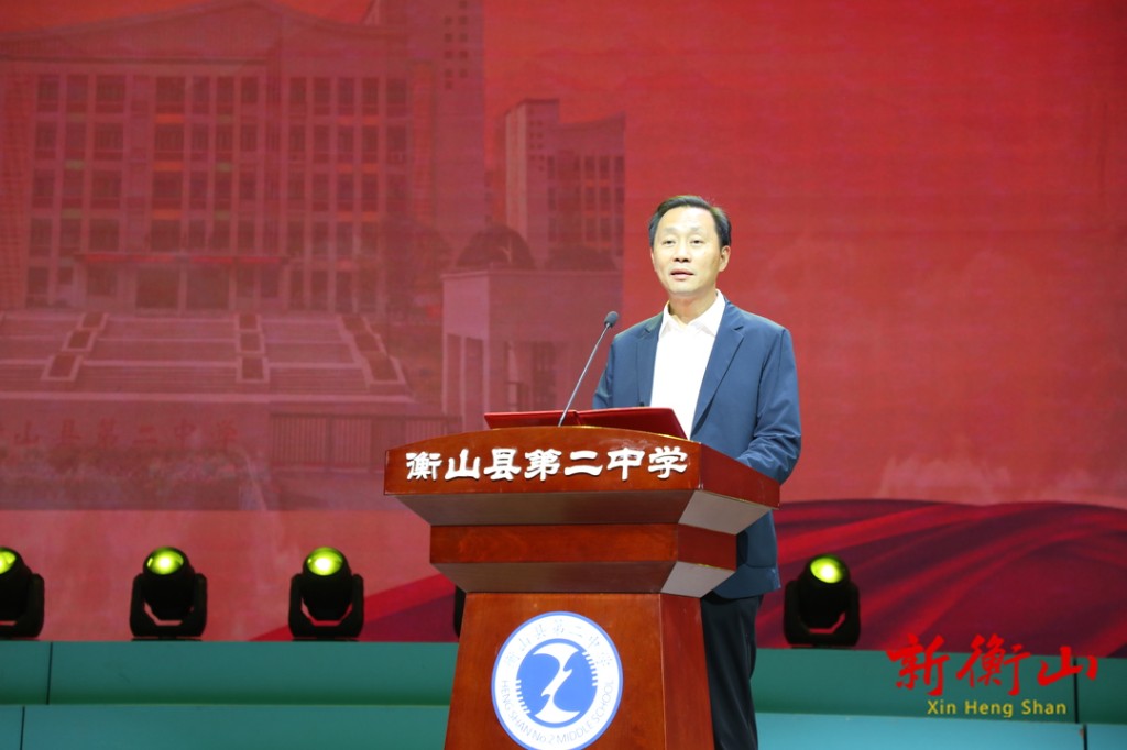 仪式上,学生代表、高三2209班李婷,衡山县第二中学助学会发起人、衡阳市达德置业有限公司董事长戴建平,校友代表、湖南科技大学校长蒋丽忠依次上台致辞,表达对母校培养的感激之情,并送上诚挚祝贺。